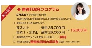 2月末までに共通審査を受験の場合、審査料が15,000円に減免、さらに進学決定時には審査料分を奨学金として納付費用から減免する期間限定プログラムのご案内です。