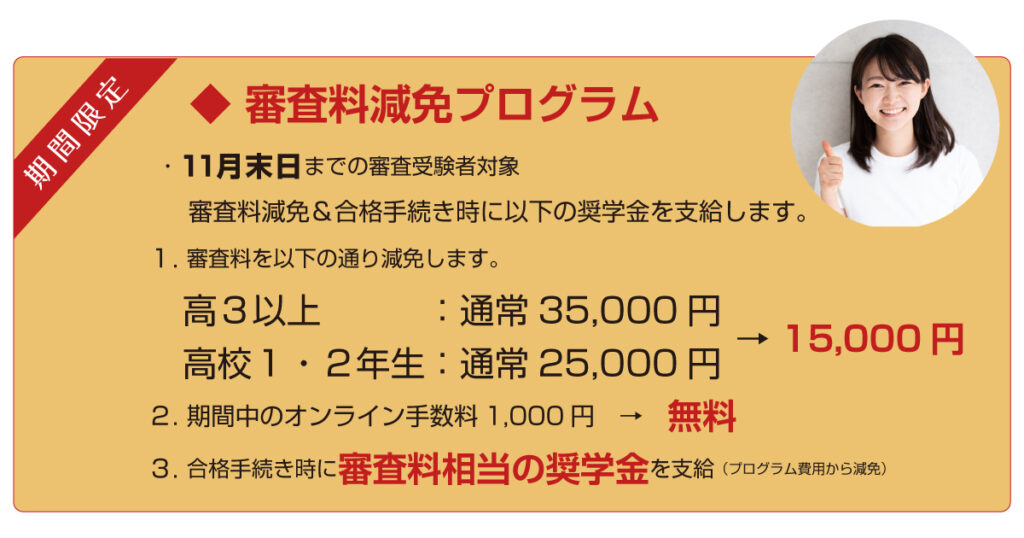 • 進学決定時に審査料分を奨学金として支給します(合格時納付金額より減免)
